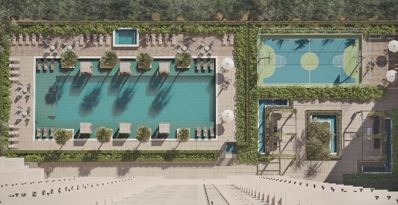 Piscina adulto com raia semiolímpica, ofurô, piscina infantil com brinquedo, piscina para convidados, piscina VIP, piscina aquecida, sauna e piscina para pet.